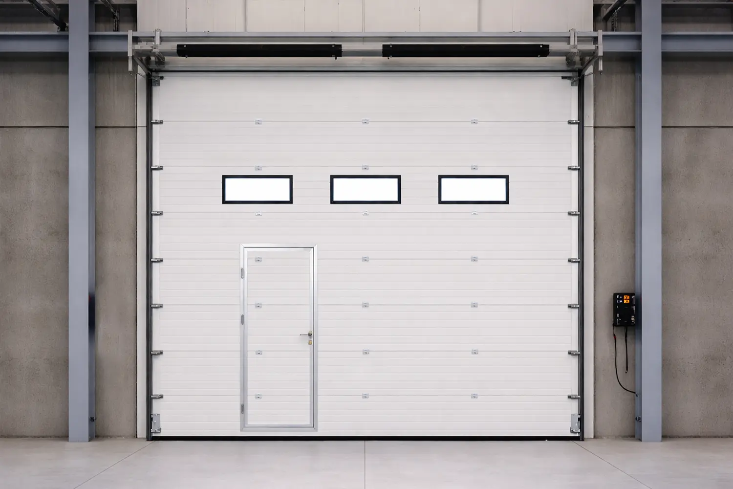 High-efficiency modern industrial sectional doors featuring a built-in pedestrian wicket door and natural lighting vision panels. PU foam insulated and CE certified. Manufactured by ABX for B2B logistics and commercial facilities.