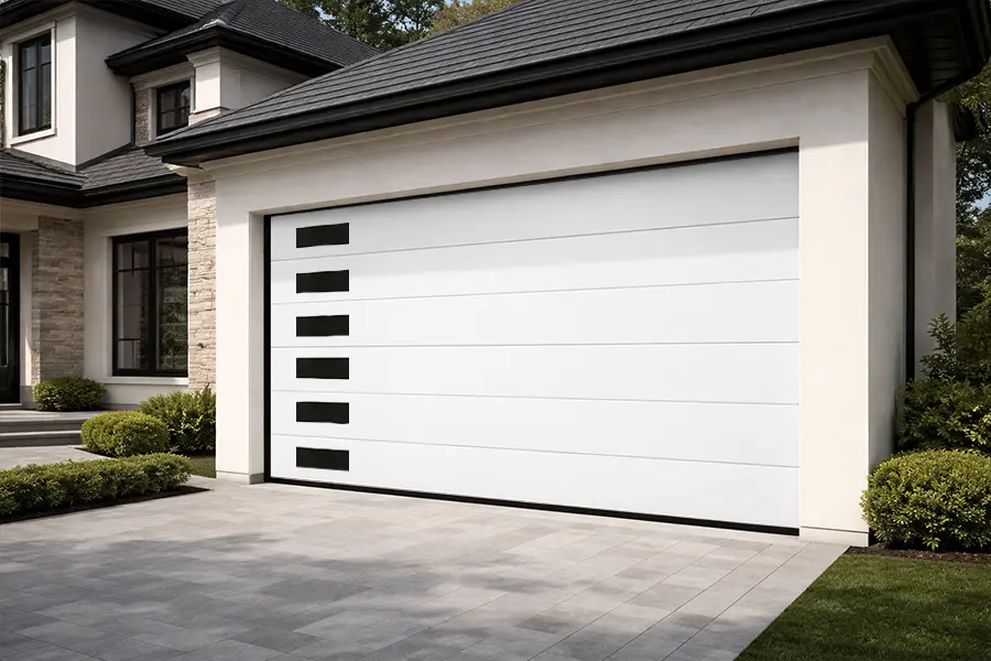 Engineered in accordance with ANSI/DASMA 108, ABX modern steel garage doors feature vertical side windows, 42kg/m³ PU core, and 50,000-cycle torsion springs.